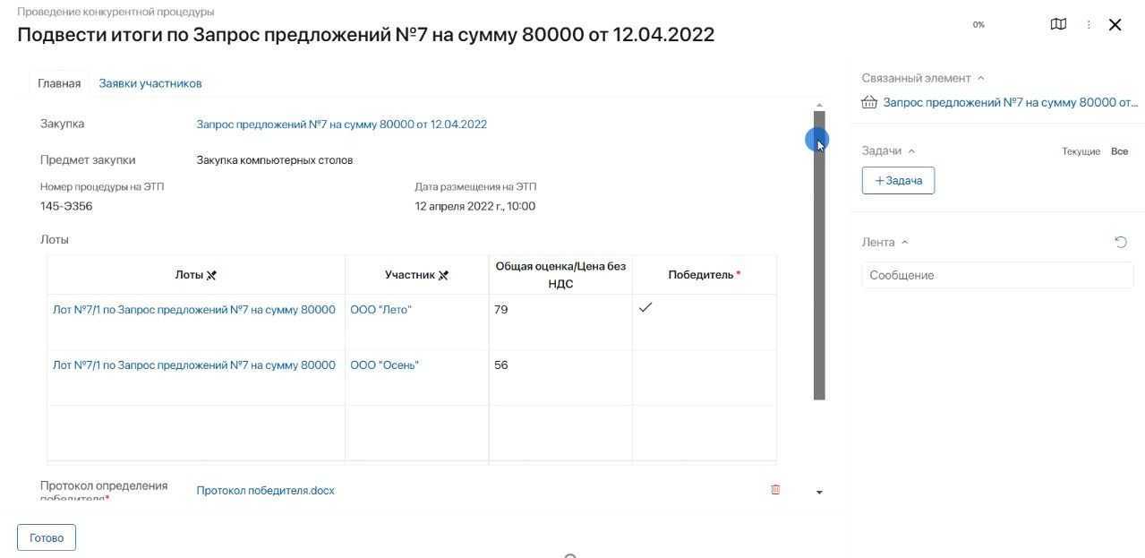 Это завершающий этап автоматизации процесса закупок. Закупка выложена на торговую площадку, а ответственный сотрудник осуществляет сбор заявок по данной закупке. Как это происходит? Выполняется ввод данных о заявках участников