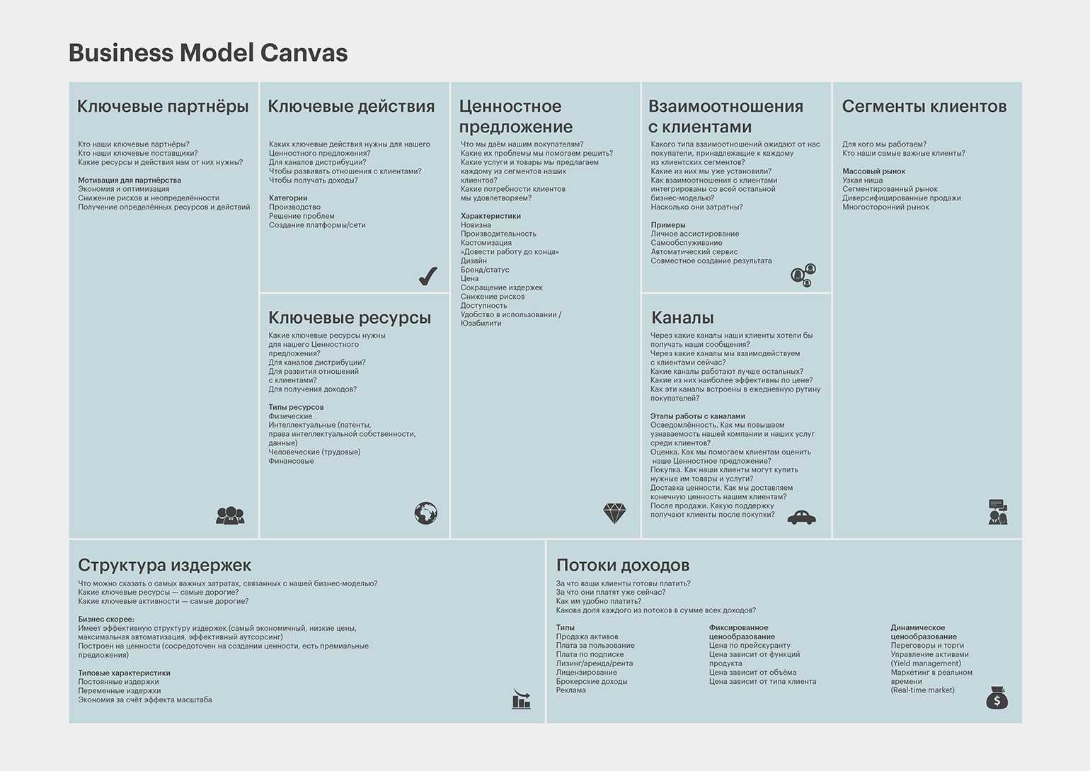 Первая — шаблон бизнес-модели, или Business Model Canvas. Она создана теоретиками Александром Остервальдером и Ивом Пинье. Модель Остервальдера популярна среди стартапов, IT-компаний и инноваторов.