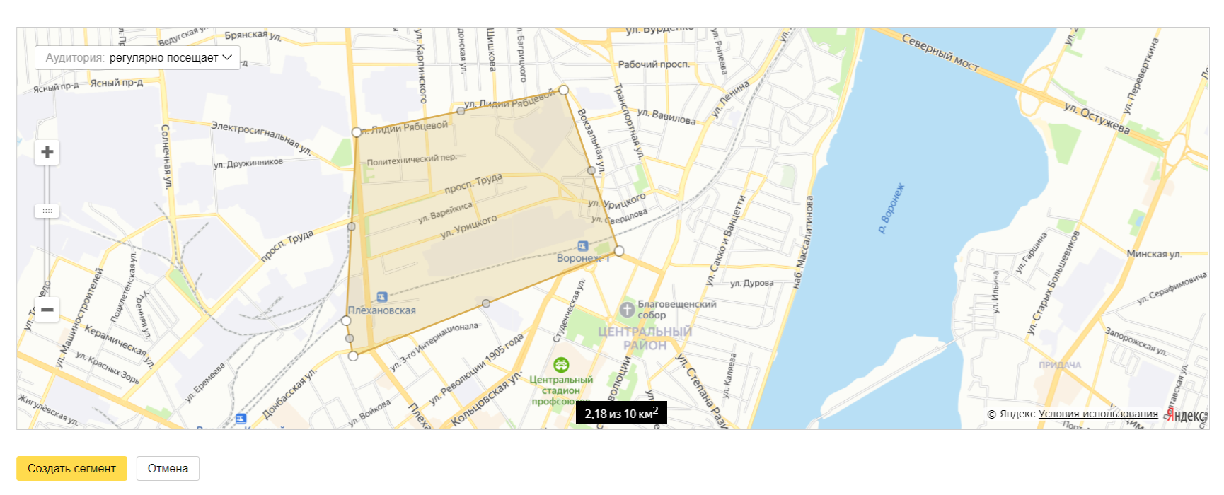 Создание полигона в Яндекс.Аудиториях. На основе данных о том, где регулярно бывают пользователи, можно создать аудиторию и показывать ей релевантную рекламу