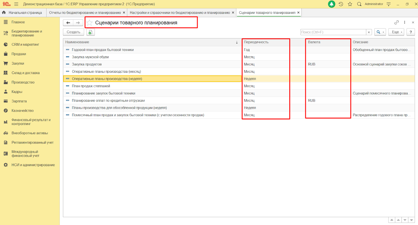 Справочников «Сценарии товарного планирования» может быть несколько в зависимости от периодичности и валют.