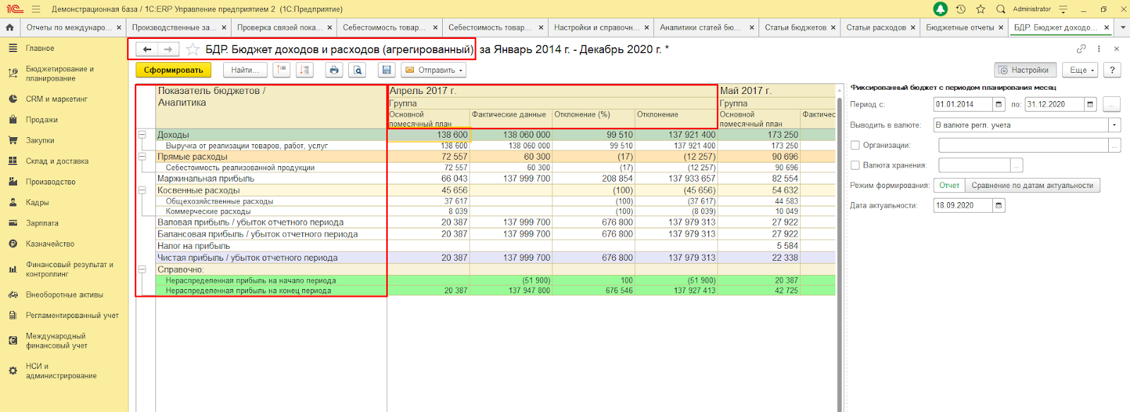 Преимущество ведения учета и контроля данных в 1С заключается в том, что план-фактный анализ прогнозной прибыли можно проводить в любой момент времени независимо от закрытия периода, т.е. на разных этапах планирования. К примеру, это можно делать через отчет «Бюджет доходов и расходов».