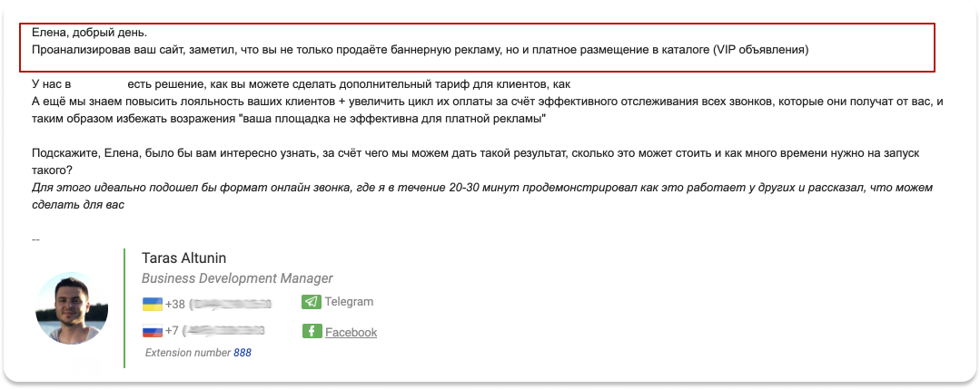 Пример персонализированного письма, в котором клиент узнает о том, какие выгоды ждут именно его бизнес: