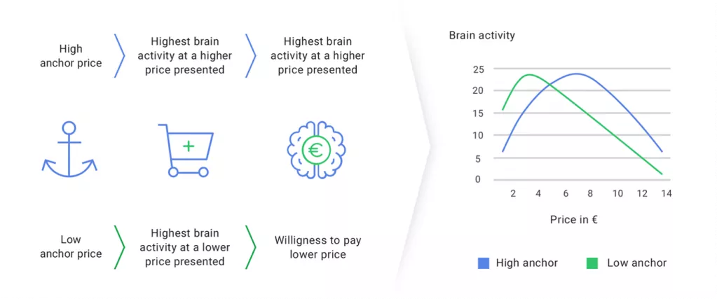 Создание «якорей» в сознание – одно из самых значимых психологических паттернов, которые влияют на покупателей. В частности, создание «якорей» влечет за собой доверие к первой поступившей в сознании информации (что и есть «якорь») в ходе выбора между несколькими товарами. Поэтому чем выше якорь, тем выше желание клиентов платить. Иллюстрация ниже показывает, почему «якорь» так важен.
