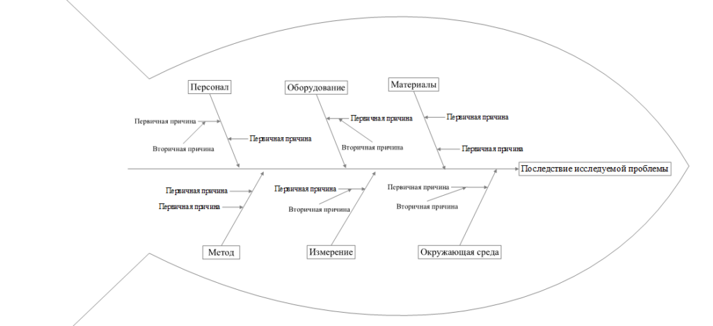 Диаграмма Исикавы по своей структуре напоминает скелет рыбьей кости. В заглавие у нее обозначено последствие проблемы, причину которой необходимо выяснить. Именно поэтому диаграмму Исикавы так же называют диаграммой «рыбьей кости». Причины обсуждаемой проблемы дополняют данный скелет. Эти причины формируют полную картину о ситуации. Причем причины обозначают стрелкой, входящей в фактор проблемы. Далее для принятия решения о корневой причине применяют тактику «мозгового штурма».