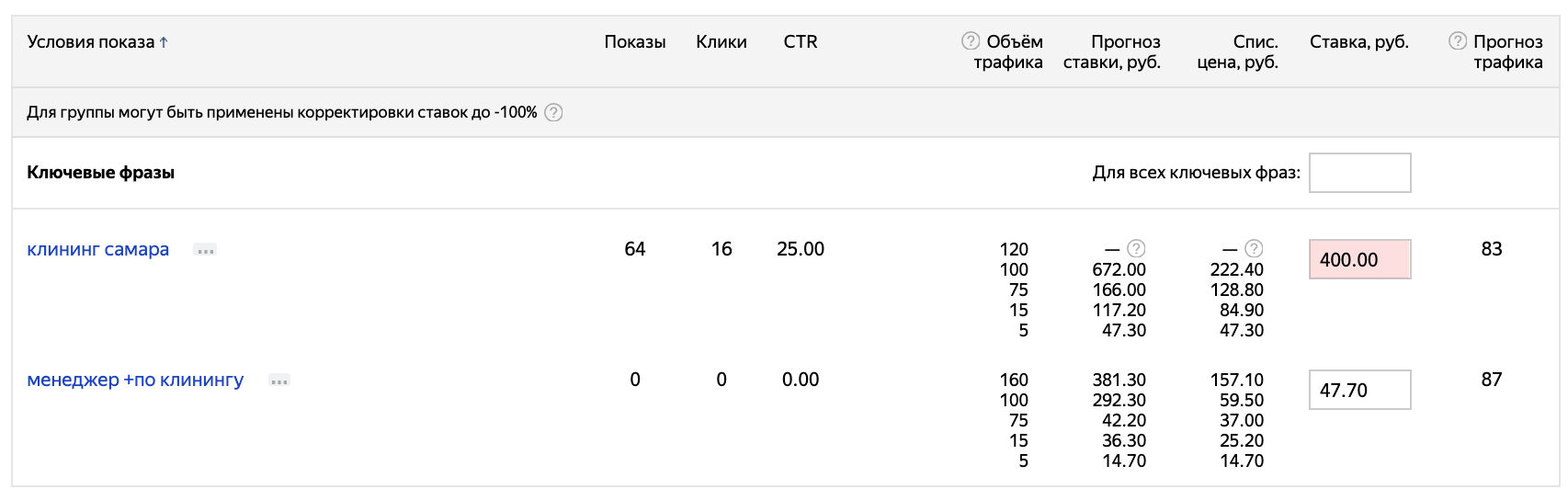 И действительно, в большинстве тематик ставки даже в регионах высоки настолько, что остается только удивляться — а считают ли рекламодатели ROI? Особенное мракобесие творится в тематиках, в которых предложение превышает спрос. Пример из недавнего — услуги клининга в Самаре.