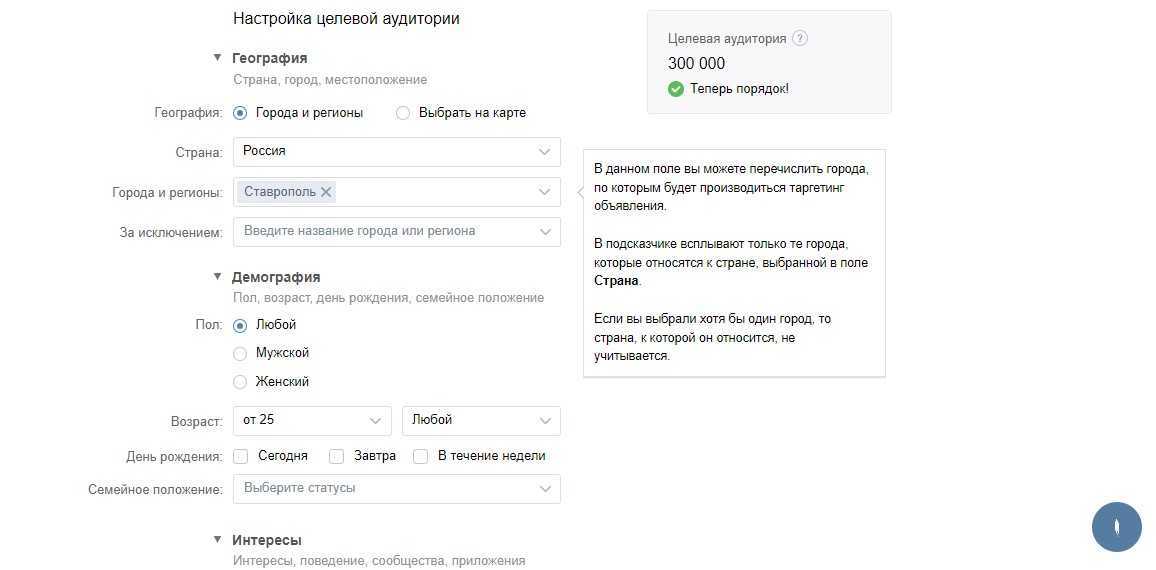 На основе этих данных выясняем размер целевой аудитории в регионе, в котором планируем продавать. Допустим, это Ставрополь. Чтобы оценить число мужчин и женщин в нужном возрасте, можно использовать рекламные кабинеты. Проще всего посмотреть данные во «ВКонтакте»: указываем пол и возраст и видим, что размер нашей выборки 300 тысяч человек.