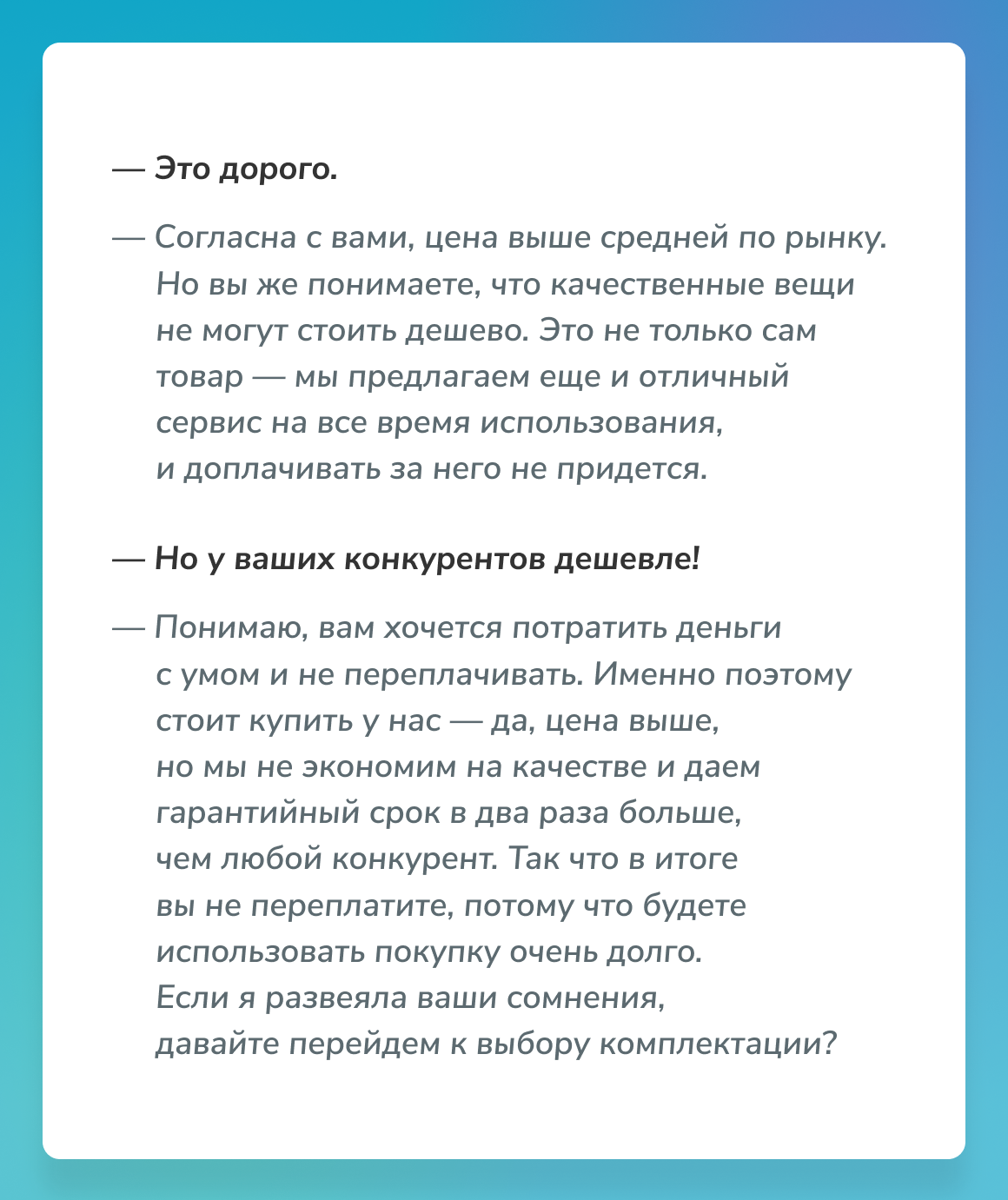 Перейдем к конкретике — разберем, как отвечать на распространенные возражения на примерах.