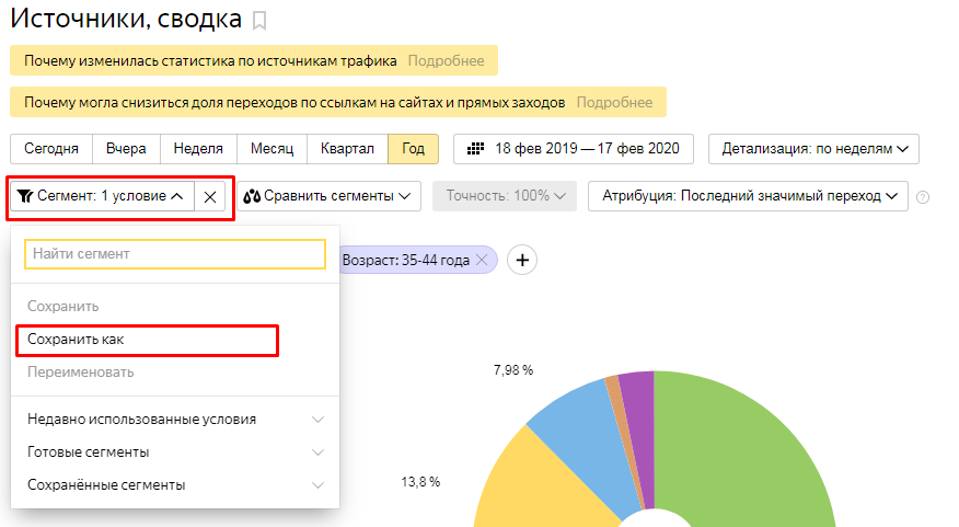 Глубина просмотра отображается сразу на главной странице «Сводка». Если кликнуть на нее, то откроется более подробный отчет, который можно настроить по времени и сегментам.