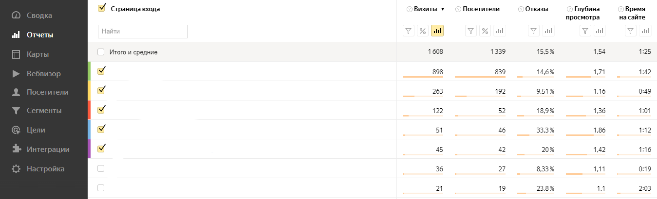 Вот так выглядит этот отчет в Метрике. На скриншоте видно, что глубина просмотра у разных страниц составляет от 1,1 до 1,86: