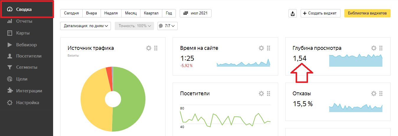 Чтобы узнать среднюю глубину просмотра по сайту в целом, можно зайти в раздел «Сводка». Там выводится виджет с этим показателем: