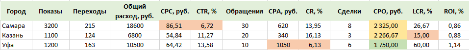 Приведем пример из поисковой рекламы. Мы запускаем рекламные кампании в тематике продажи нового типа стройматериалов. Некоторые продажи уже есть, но их мало, поэтому мы используем запросы по похожим материалам и разрабатываем промостраницу с контактами, ценами и лид-магнитами. Рекламируемся на несколько городов: Самара, Уфа. Целевая стоимость одного заказа (исходя из данных о марже и прогнозном среднем чеке) — условные 2000 рублей. Спустя две недели ведения рекламы и проверок первых гипотез мы видим следующую картину: коэффициент ROI превышает единицу только в кампаниях на Уфу.