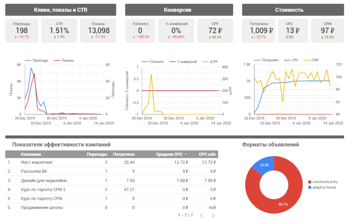 А отслеживать динамику коэффициента конверсии удобно в отчетах DataFan. Выберите один из шаблонов по таргетированной рекламе для внутренних отчетов или Google Data Studio и анализируйте этот показатель в разрезе разных периодов времени, рекламных кампаний и других параметров.