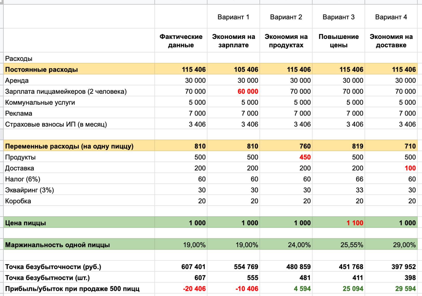 У Дениса пиццерия, много заказов, постоянный доход, но денег почему-то нет. Постоянные кассовые разрывы, пусть и небольшие. То на аренду не хватает, то на закупку продуктов. Объем продаж — 500 пицц в месяц, заказы и оплаты идут через сайт, для доставки пользуются сервисом такси. Денис сделал расчет точки безубыточности и очень удивился. Оказывается, для выхода в плюс ему нужно продать 607 пицц, а сейчас компания генерирует убыток больше 20 000 рублей!