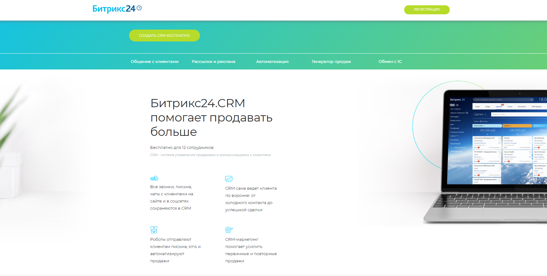 Пример популярной CRM — Bitrix24. Для компании до 12 сотрудников она бесплатна. Обладает простым в освоении интерфейсом и большим количеством готовых шаблонов. Позволяет работать с сайтом, телефонией, мессенджерами, соцсетями и электронной почтой. Большим плюсом является возможность интеграции в 1C и наличие мобильных приложений.