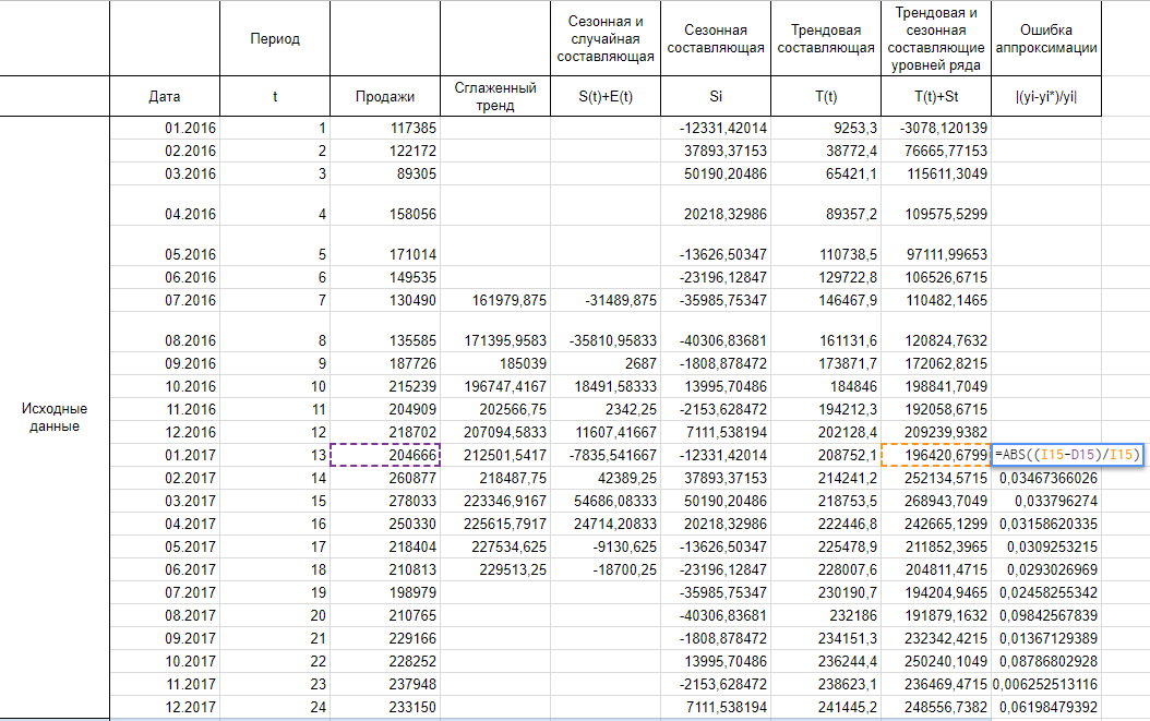 Итак, рассчитываем ошибку аппроксимации для нашего случая. Так как в основе нашего тренда лежит полином третьей степени, прогнозные значения начинают хорошо повторять фактические значения к концу 2016 года, думаю, я думаю, поэтому корректнее было бы рассчитать ошибку аппроксимации для значений 2017 года.