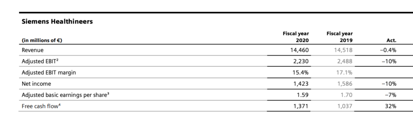 Чистая прибыль Siemens Healthineers в 2020 отчетном году составила 1,42 млрд евро, что на 10% меньше прибыли, зарегистрированной по итогам 2019-го. Налоговые выплаты составили 27,2% по сравнению с 27,7% в 2019 финансовом году. Скорректированная базовая прибыль на акцию снизилась на 7% до 1,59 евро.