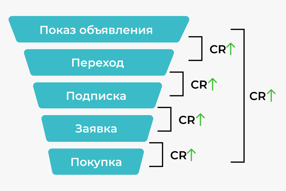 Работайте над конверсией на всех этапах воронки продаж. По большому счету конверсия из просмотров в клик по объявлению, из клика в подписку, а из подписки в лид волнует только рекламщиков и маркетологов. Бизнесу важная только одна конверсия – в продажи. Однако если мы будем планомерно повышать показатели на всех этапах, то и конверсия в продажи при том же бюджете вырастет.