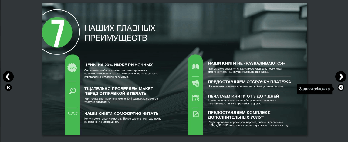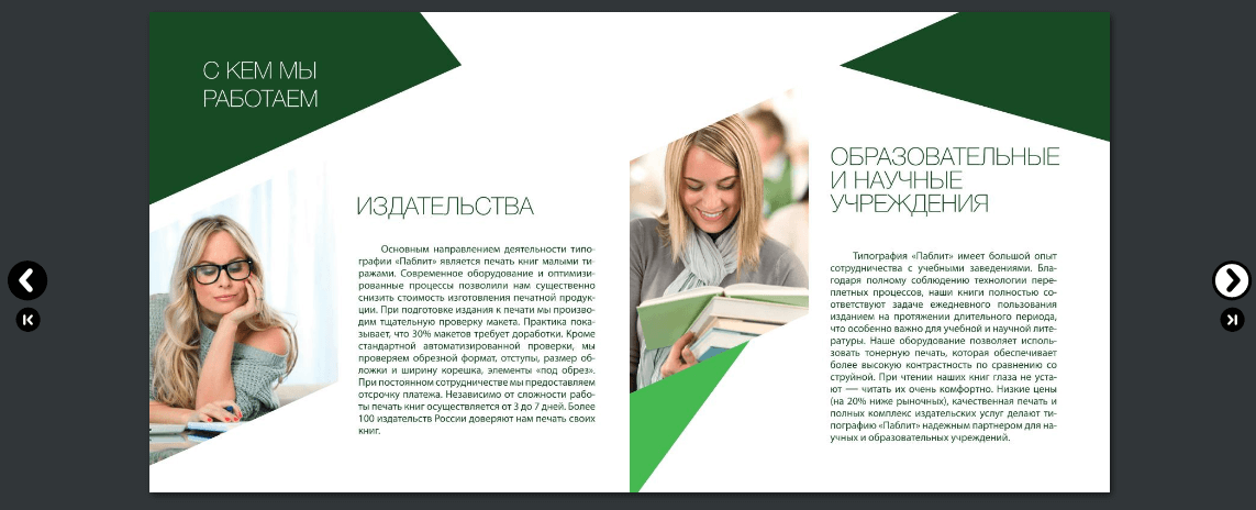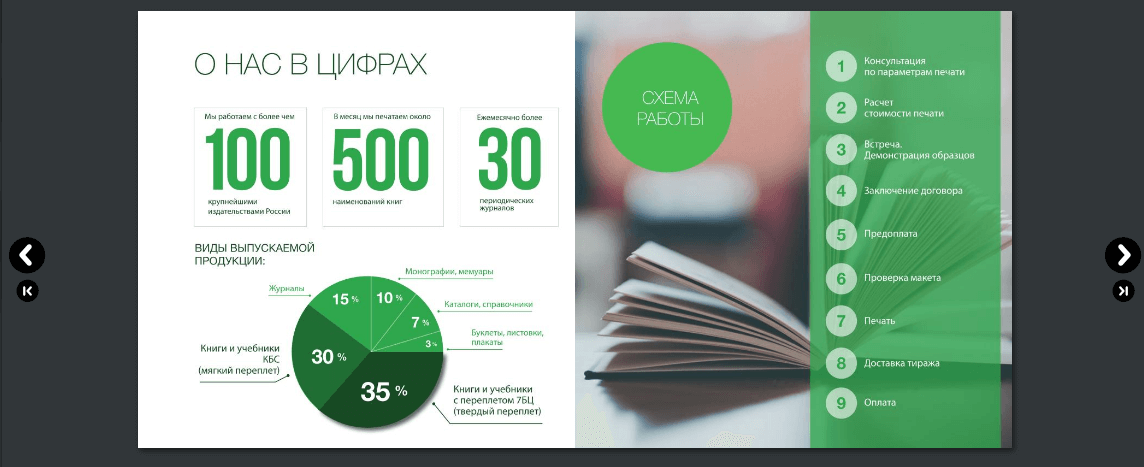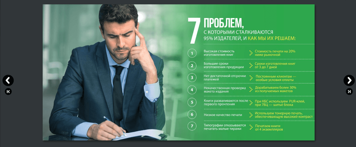 Профессиональные фото собственного производство — сыльнейший продающий триггер. Компания «Паблит» с первого слайда вызывает у клиента доверия, понимания технических возможностей, сроков и мощностей печати. Именно на скорость изготовления и минимальный тираж сделан особый акцент: