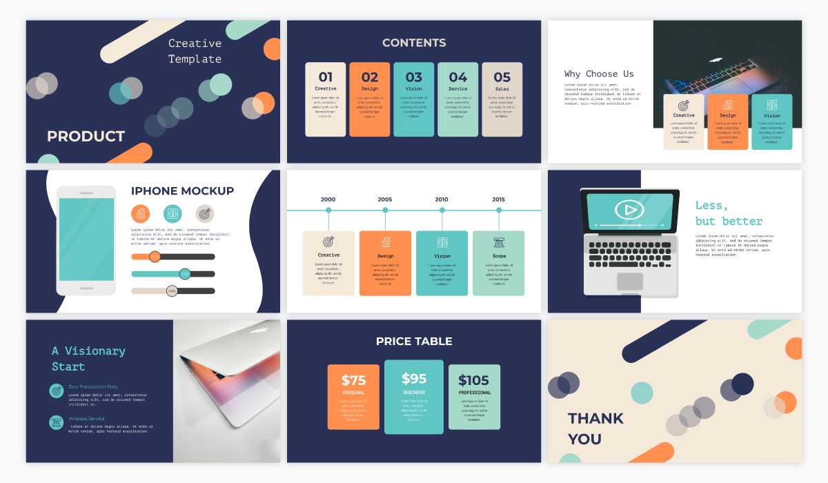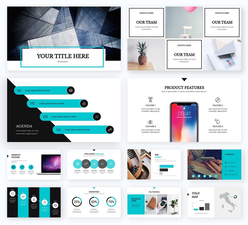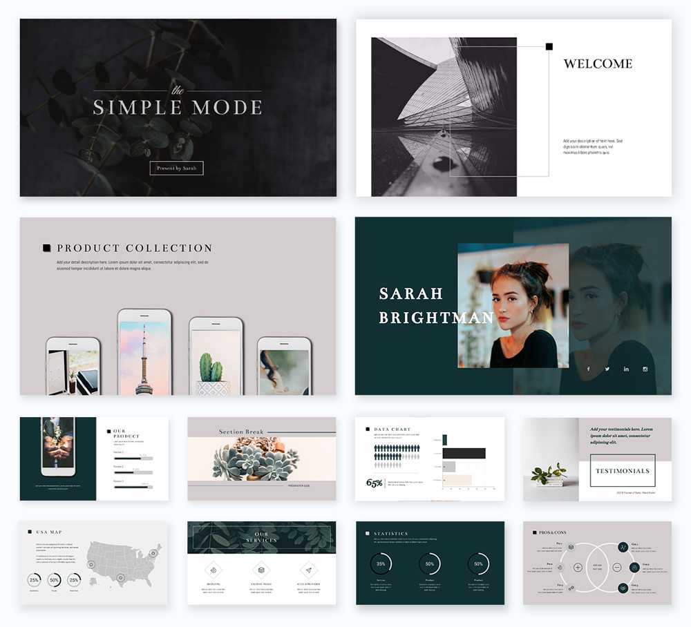 Как и в предыдущем, в этом простом шаблоне презентации больше 300 слайдов в 20 разных категориях. Сначала выберите те слайды, которые вам нужны, а затем поработайте над компоновкой элементов на них.