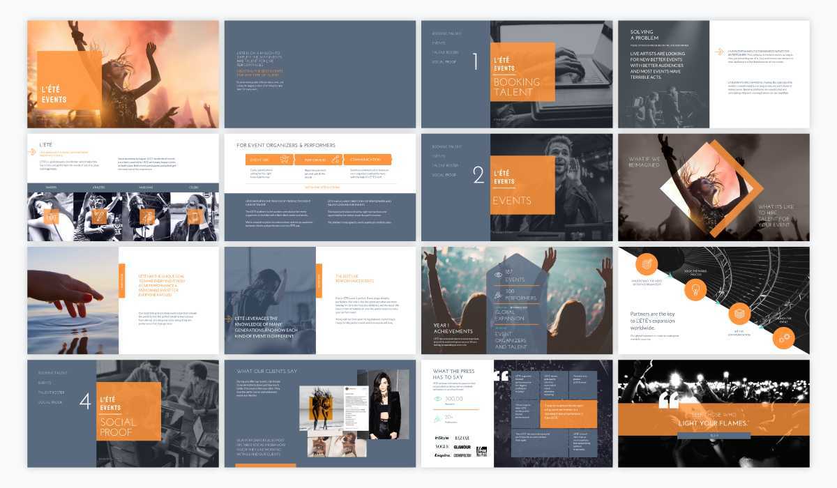 Присмотритесь к этому шаблону, если вы продаете билеты и спонсорские пакеты для мероприятий. Такая презентация подойдет для мероприятий, которые проводятся вживую или в онлайне – и на тех, и на других есть участники, билеты, спонсоры и т. д.