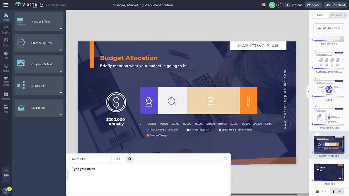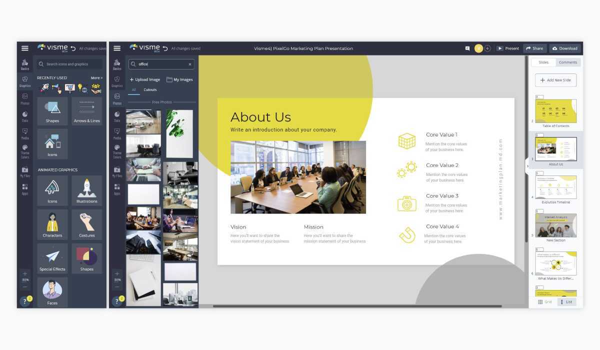 Создавать презентации в Visme очень просто. Здесь уже есть все необходимые элементы дизайна и визуализации данных, которые помогут вам сделать продающую презентацию красивой и запоминающейся.