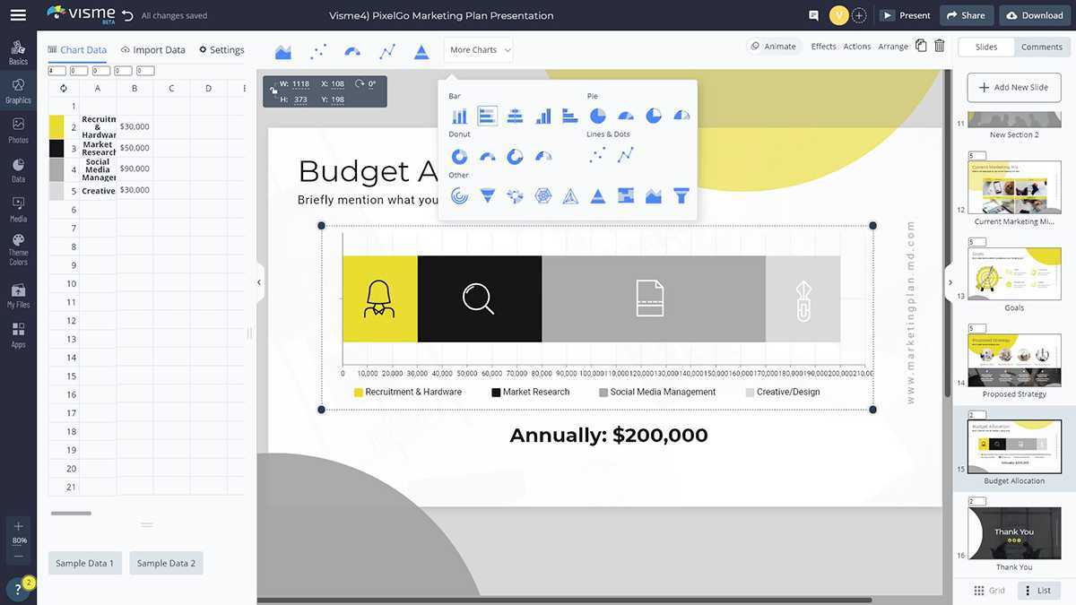 Редкая презентация обходится без графиков и диаграмм. В редакторе Visme можно создавать линейные и столбчатые диаграммы, диаграммы рассеяния и не только.