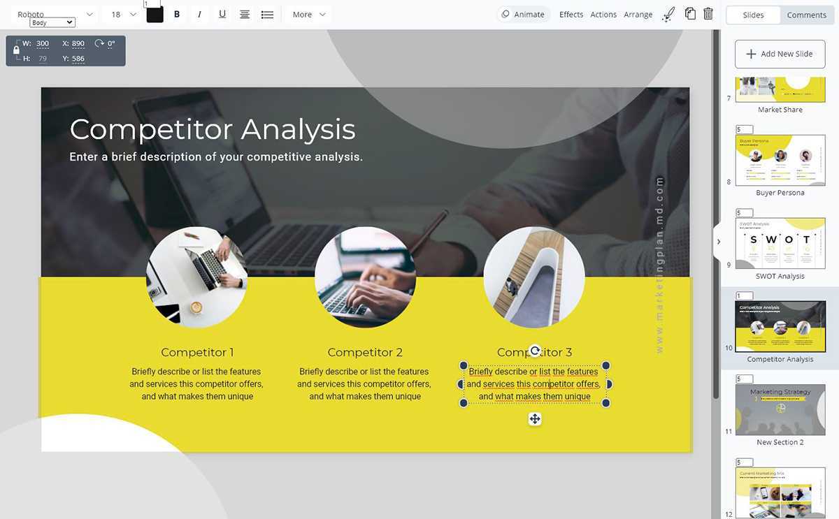 Добавьте в презентацию информацию в соответствии с вашим планом. Не спешите и продвигайтесь от раздела к разделу, чтобы ничего не упустить. Если нужно, меняйте размеры текстовых блоков в редакторе.