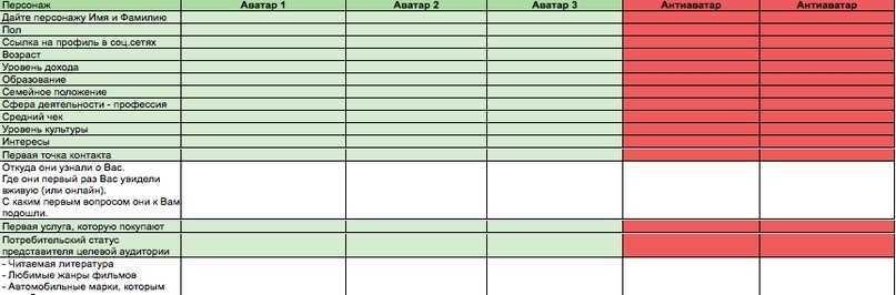 Эту таблицу нужно заполнить максимально подробно данными о каждом из типов клиентов. А также расписать «антиаватары» — клиентов, с которыми не хочется контактировать.