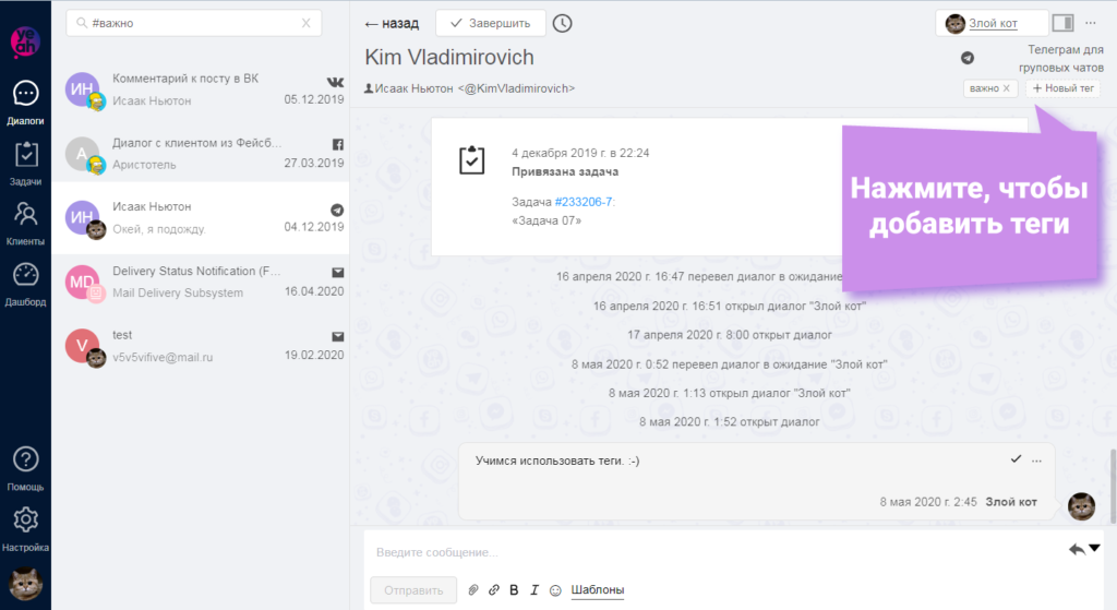 Резюмируем процесс классификации обращений и заявокКлассифицируйте. Используйте теги, чтобы расставить приоритеты и рассортировать обращения по тематикам. Для этого нажмите на «новый тег» в диалоге, введите подходящее слово, а затем в фильтрах выберите это слово , чтобы среди всей массы диалогов найти нужные.