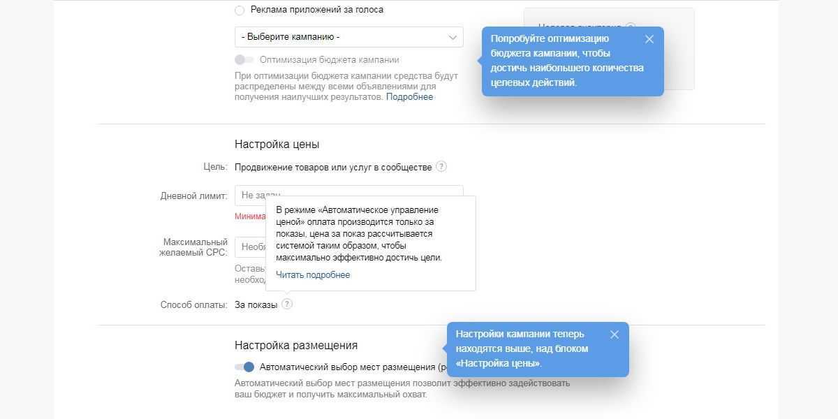 В первых рекламных кампаниях объявлениям лучше ограничивать бюджет. Если ограничений не ставить, есть шанс потратить все деньги в рекламном кабинете на одно неработающее объявление.