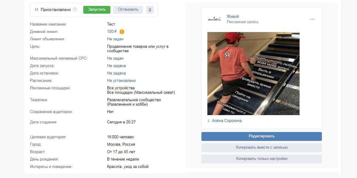 Я редко ориентируюсь на цену клика. Да, у меня есть внутренний стоп, который говорит, что 100 рублей за клик – TOO MUCH. Но, если мне нужно, чтобы какая-то аудитория увидела определенный пост, то я буду его крутить. Независимо от цены.