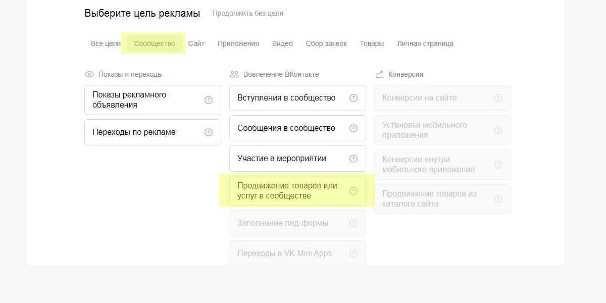 По плану мы хотим привлечь целевую аудиторию в сообщество. Поэтому для таргетированной рекламы для примера в ВК выбираем блок с целями для сообщества → Продвижение товаров или услуг в сообществе.