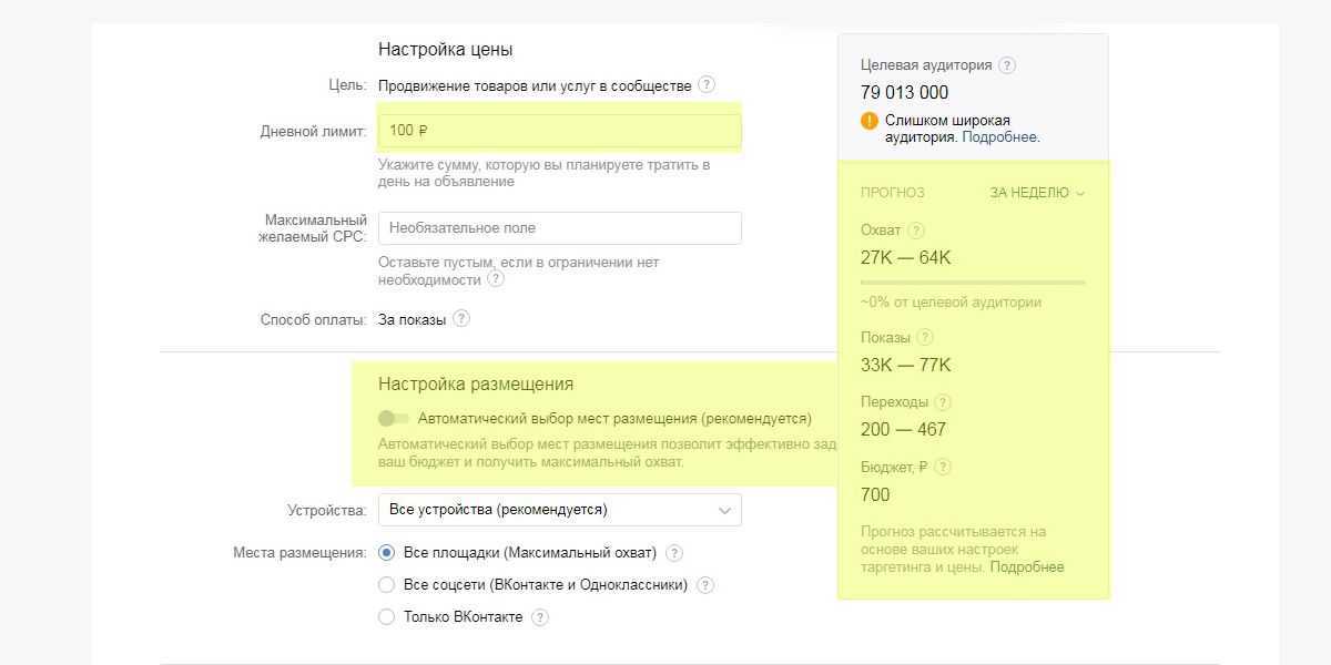 При установке дневного лимита появляется прогноз кампании. Если снять галочку с автоматического выбора размещения, можно настроить его вручную