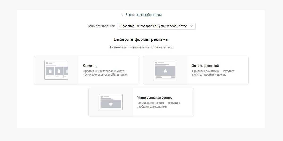 Выбираем наиболее подходящую цель, далее вам предложат максимально подходящие форматы рекламы.