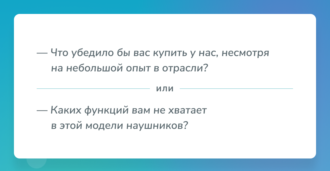 Потом вы можете задать открытые уточняющие вопросы — это поможет вам скорректировать свою стратегию отработки возражения и раскрепостить клиента.