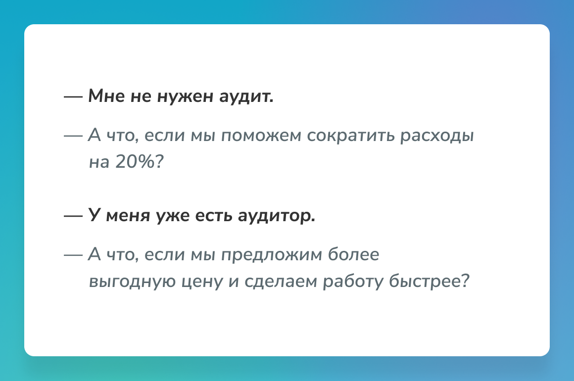 Эта техника отработки возражений подойдет для отговорок — когда клиент пытается прекратить диалог сразу же. Обычно при этом употребляются фразы «У меня все есть»/«Нам ничего не нужно». Этот прием нужно сочетать с аргументацией выгоды, то есть предлагать клиенту решение его проблем: