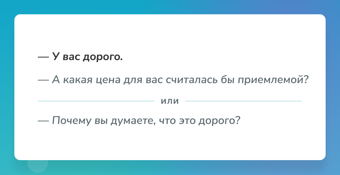 Во-вторых, можно задавать встречные вопросы, уточняя потребность клиента. Иногда люди машинально отмахиваются от продажников фразой «Мне дорого», и это поможет завязать диалог.