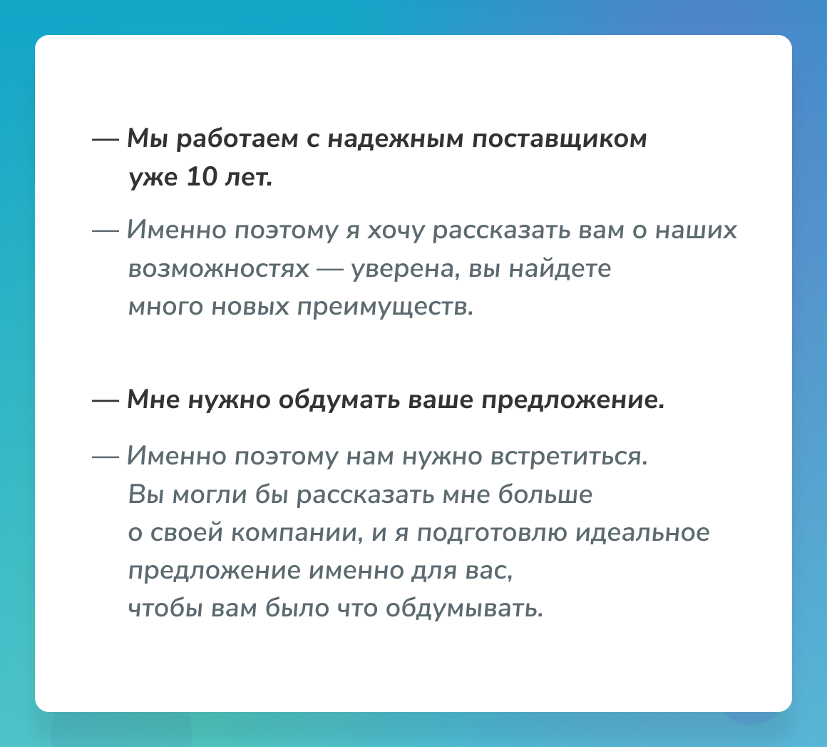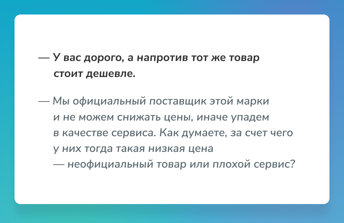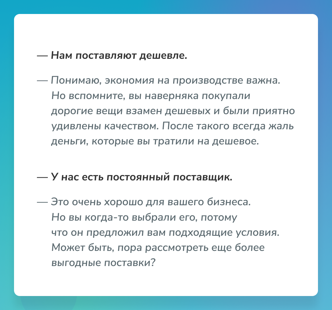 Как видите, в этом примере все этапы работы с возражениями — выслушали клиента, присоединились к нему, показали понимание проблемы, аргументировали цену и предложили перейти на следующий этап сделки.