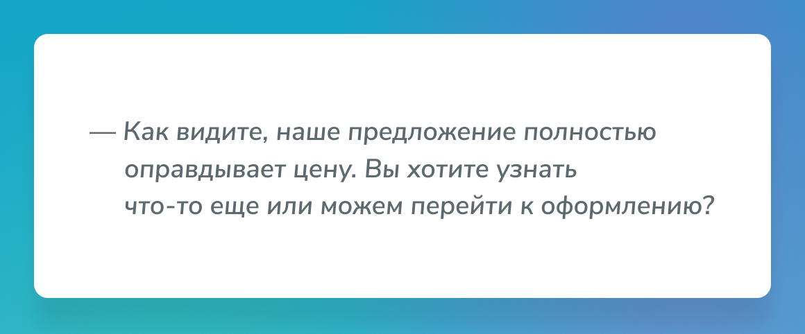 Это важный шаг алгоритма работы с возражениями. Многие начинающие продажники забывают или боятся двигать сделку дальше и ждут реакции клиента. Это критическая ошибка — клиент почувствует неопределенность и может либо сорваться со словами «мне нужно подумать», либо начнет выискивать новые возражения.