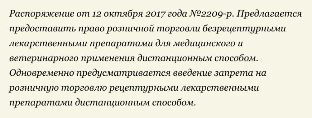 Принятый акт разрешил продавать лекарственные препараты через интернет. Одновременно были внесены новые ограничения на торговлю лекарственными средствами. Правительство запретило продавать рецептурные препараты дистанционно. Для организаций, продающих препараты через интернет, был описан ряд сведений, которые должна указать онлайн-аптека на своем сайте: