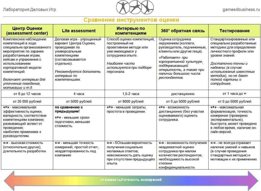Конечно же, комплексная процедура — ассессмент центр (центр оценки) — наиболее точный метод. Точность составляет до 80-85%. И, надо признать, самый затратный по времени и бюджету.