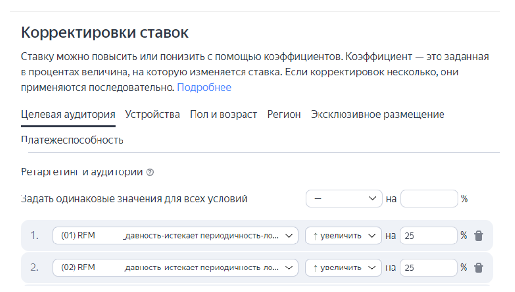 На основе наших аудиторий мы задаем корректировки ставок в настройках кампаний. До этого ретаргетинг был настроен на всех пользователей, которые посещали сайт. Теперь же делаем настройку с учетом RFM-портрета пользователя.