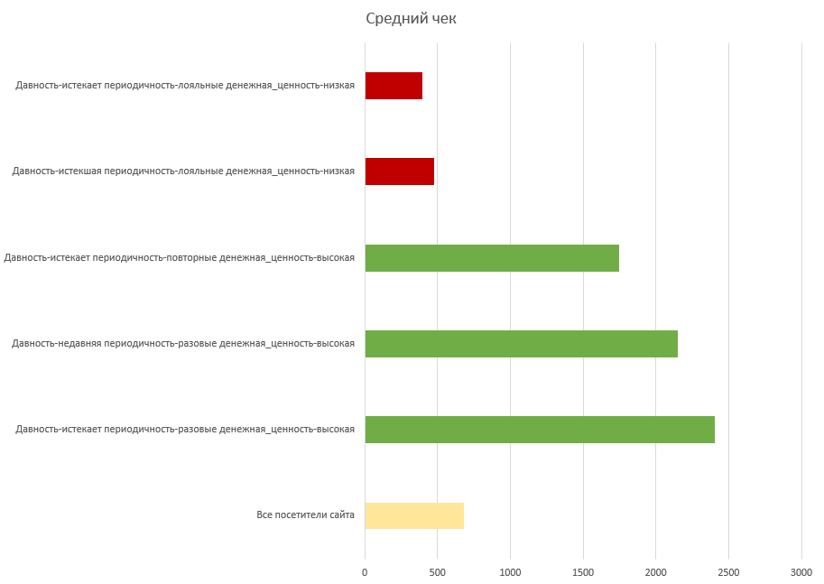 Сравниваем с сегментом «Все посетители сайта». У пользователей из сегментов с высокой денежной ценностью средний чек выше. И, наоборот, пользователи с низкой денежной ценностью имеют низкий средний чек.