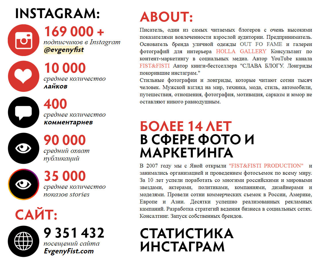 Блогеры также составляют медиакиты, где, как правило, делают акцент на аудитории и других показателях качества аккаунта (сайта). Их презентации составлены в произвольном порядке, они часто имеют простенький дизайн, так как создаются собственными силами. Но произведения искусства никто и не ждет.