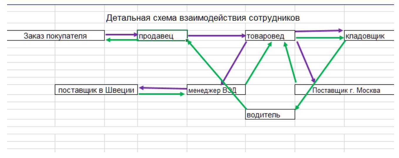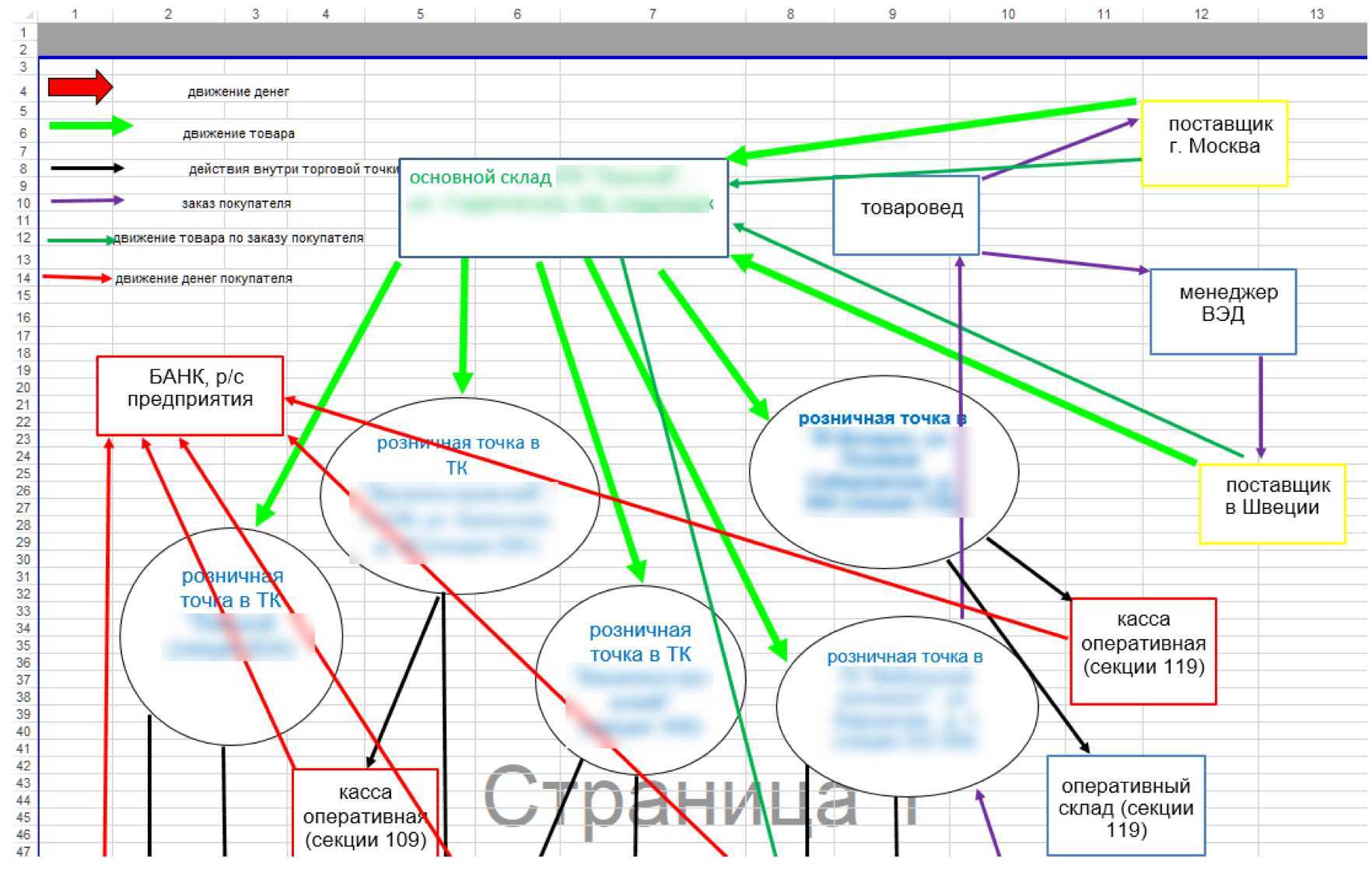 Зеленая стрелка – как двигается товар, деньги отмечу красной (чтобы все понимали важность). Наверное, надо подписать, чтоб коллеги, которые не сильно «в теме», поняли мысль