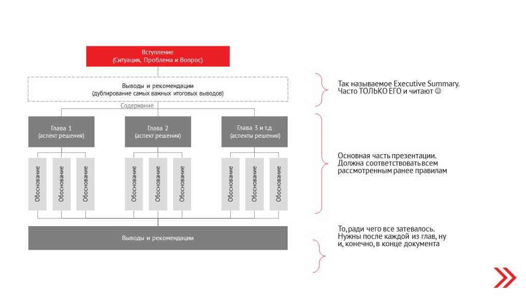 Во вступлении дайте краткую вводную информацию: опишите, в чем состояла проблема кейса, на какой основной вопрос вы будете отвечать. Затем сделайте Executive Summary: продемонстрируйте конечные выводы вашего решения. Это поможет вам разумно выстроить основную часть презентации, да и вообще покажет, что вы уважаете своих слушателей и читателей.