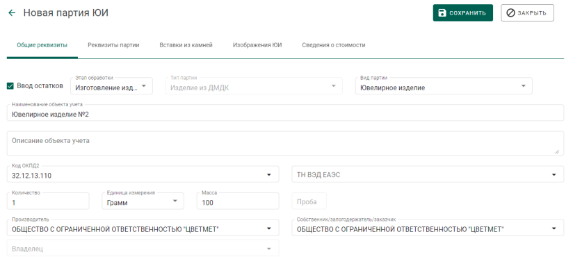 Установить признак «Ввод остатков», заполнить все необходимые реквизиты новой партии с указанием вставок ДК (при наличии) и нажать кнопку «Сохранить» (см. Рисунок 219 стр.159 РУКОВОДСТВА ПОЛЬЗОВАТЕЛЯ);