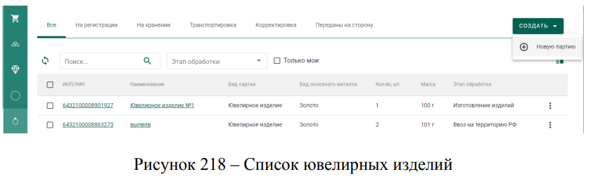 Перейти в раздел «Партии» «Ювелирные изделия» и нажать кнопку «Создать» «Новую партию» (см. Рисунок 218 стр. 159 РУКОВОДСТВА ПОЛЬЗОВАТЕЛЯ);