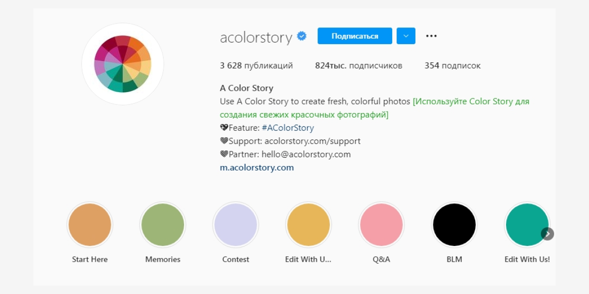 Еще один способ побудить клиентов делиться фотографиями вашего продукта в Инстаграме* – создать фирменный хештег. Поделитесь им в шапке профиля, как это сделали SMM-щики компании, создавшей приложение для обработки фотографий A Color Story.