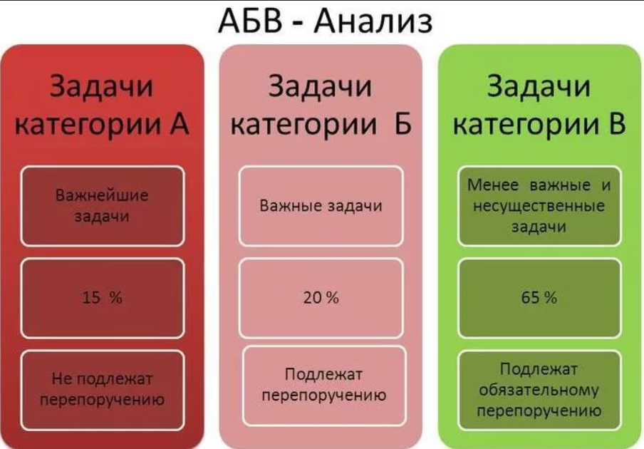 Анализ — матрица Эйзенхауэра, соединённая с принципом Парето. В этом случае дела делятся на три группы: